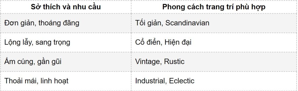 1. Lựa chọn phong cách trang trí phù hợp với sở thích và nhu cầu