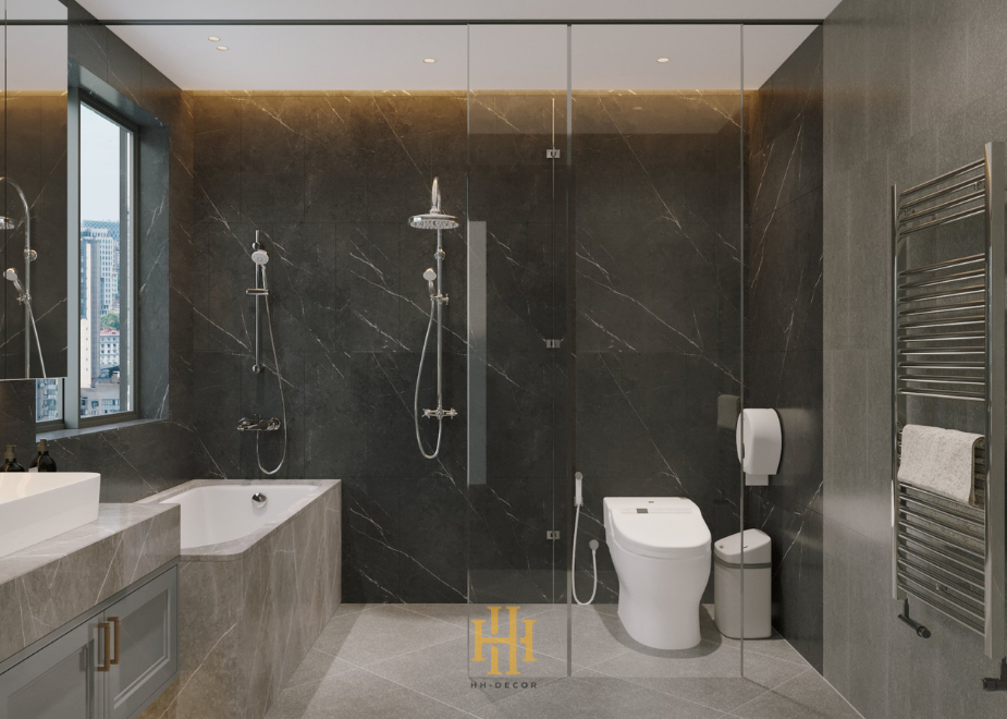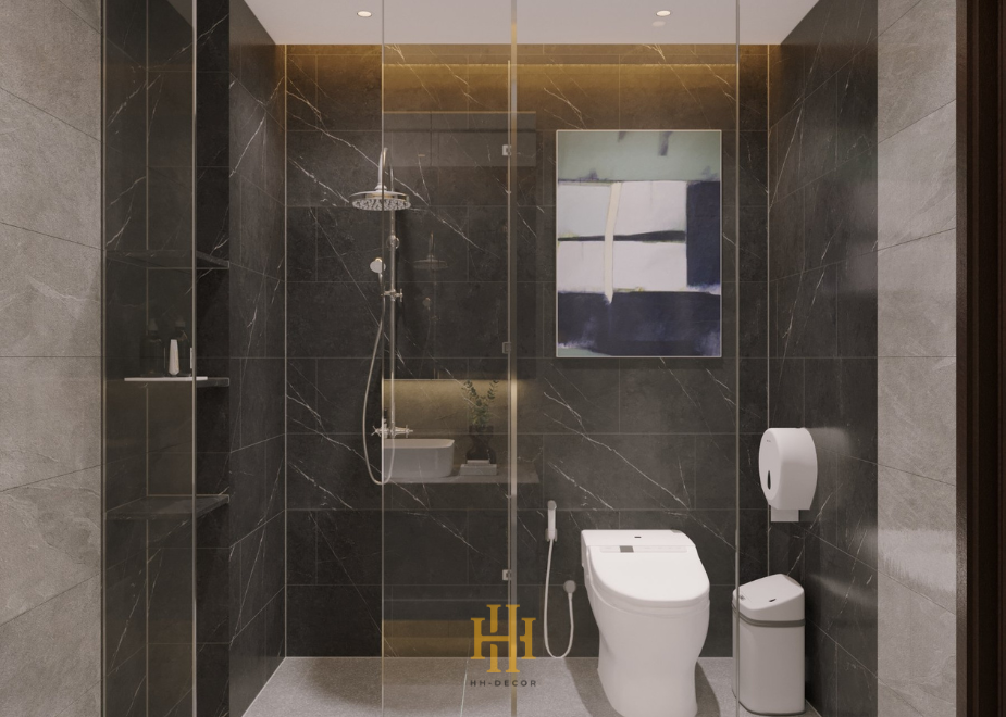 Các phòng vệ sinh, tuy là những không gian nhỏ hơn, không vì thế mà kém phần quan trọng, được thiết kế với gam màu xám đậm làm chủ đạo, tạo cảm giác sang trọng, điểm xuyết một số chi tiết màu trắng để duy trì sự đồng nhất về màu sắc của toàn bộ căn nhà.