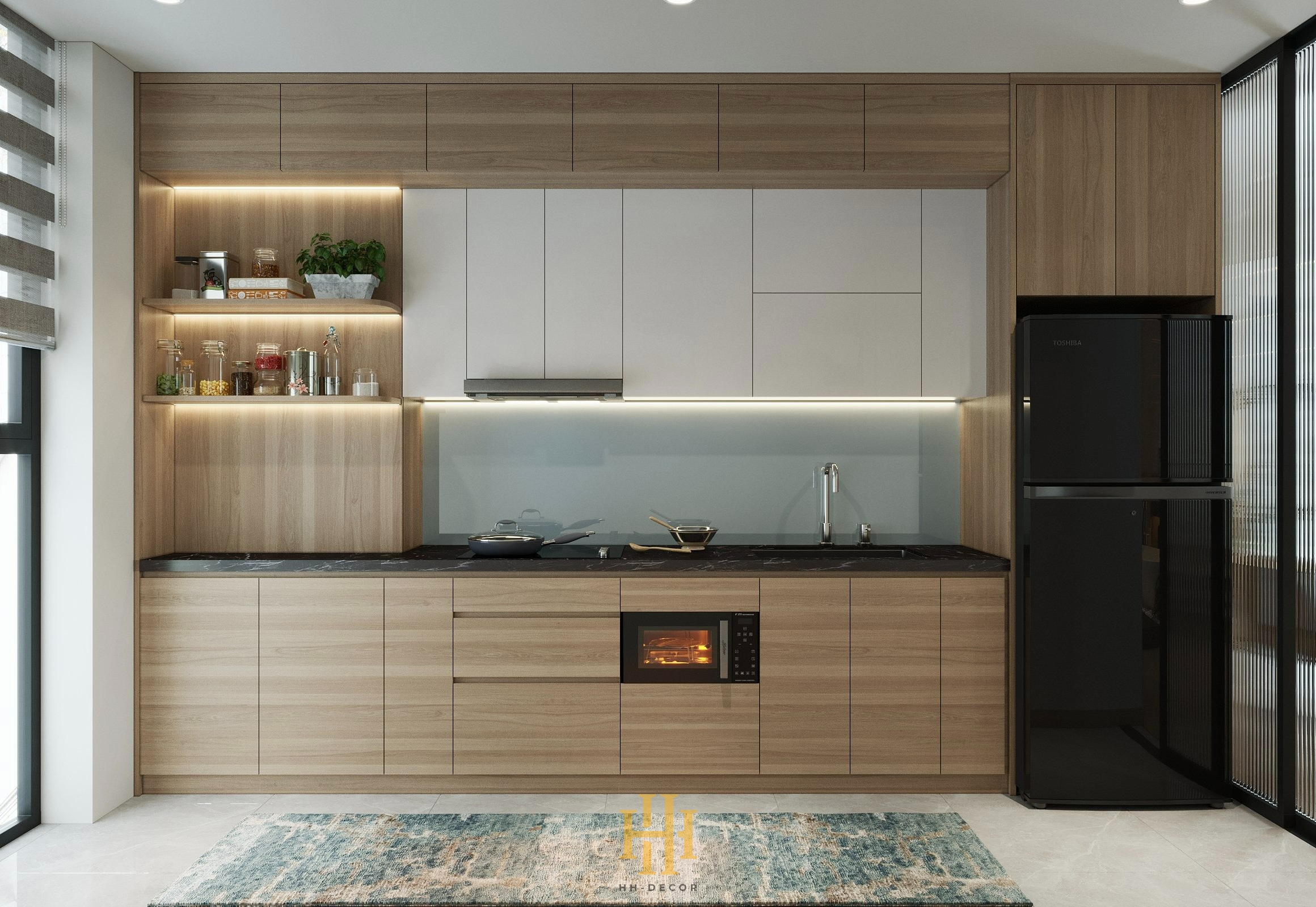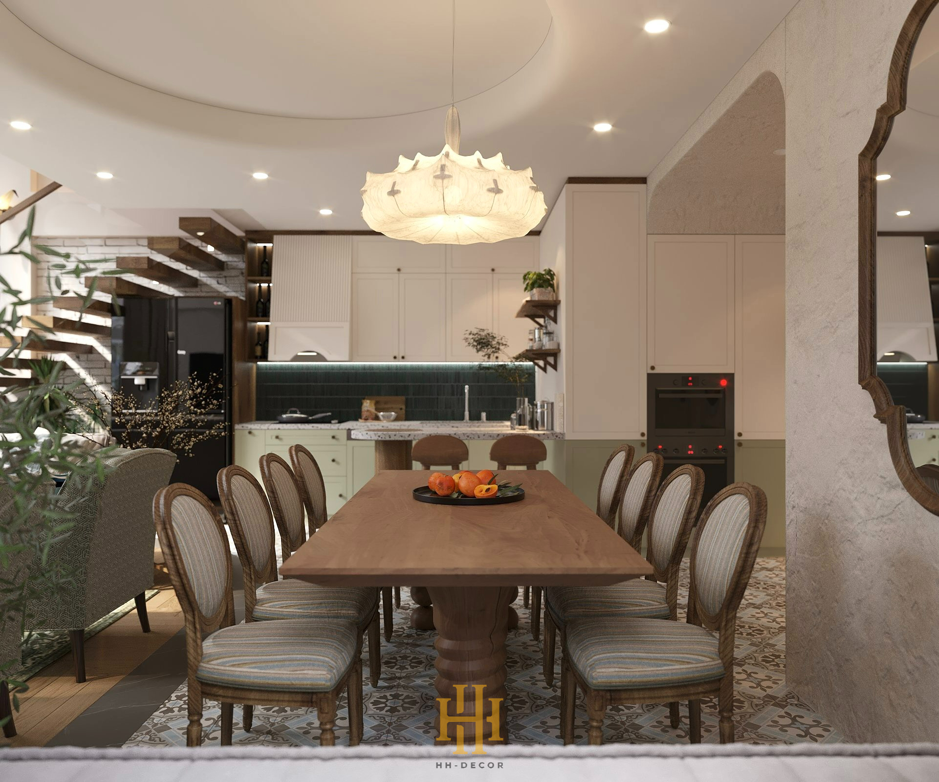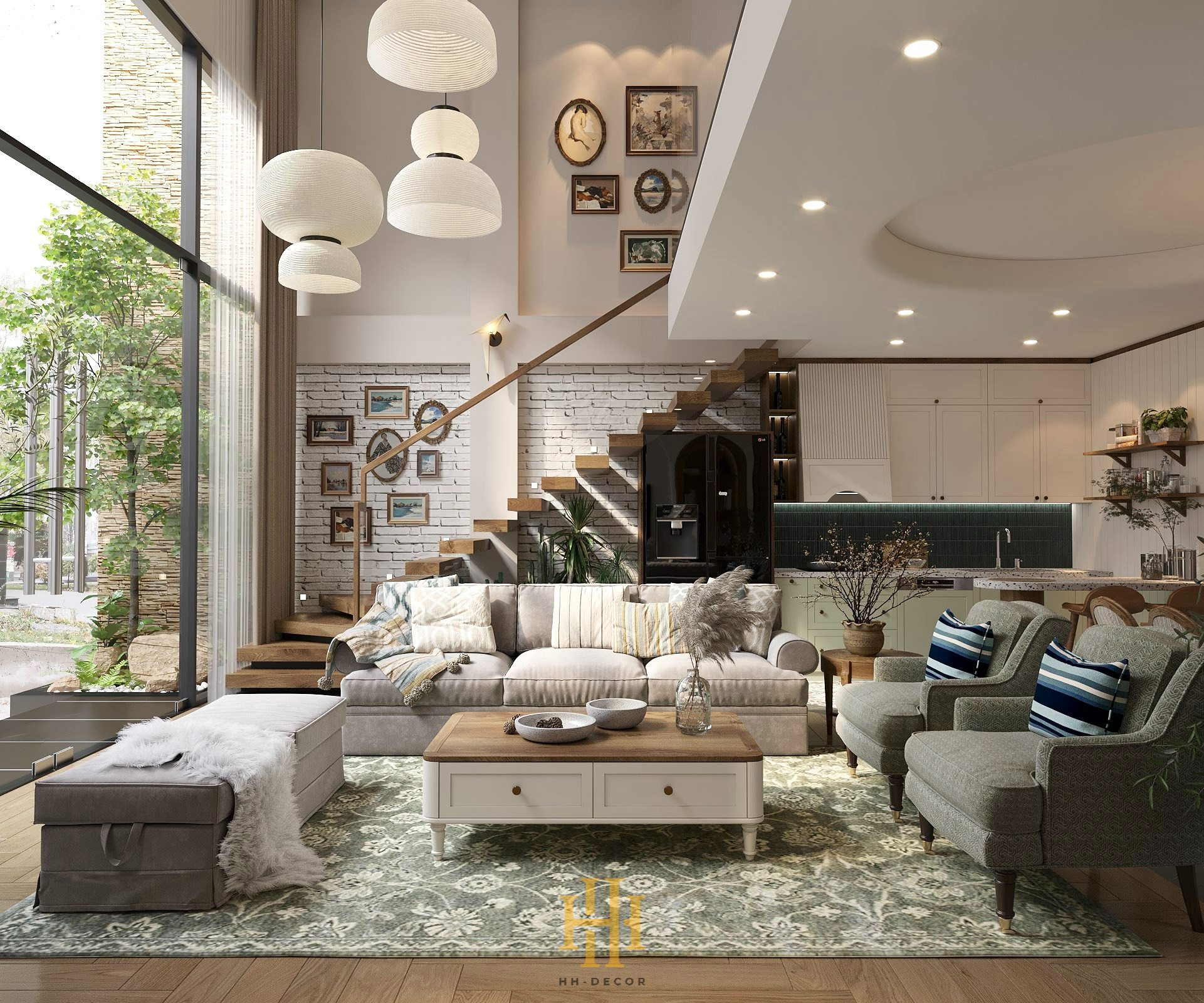 Từ ngoài sân vào, bạn sẽ bị thu hút bởi kiến trúc tinh tế của căn biệt thự với tone màu trắng thanh lịch kết hợp với những đường nét gỗ tự nhiên. Bước vào trong, tầng 1 là không gian phòng khách liền bếp ăn rộng rãi và hiện đại. Phòng khách với sofa màu trắng xám, bàn trà gỗ và những chiếc gối họa tiết trắng tạo nên không gian tiếp khách ấm cúng. Bếp ăn với đảo bếp gỗ hiện đại là nơi các bà nội trợ thể hiện tài nấu nướng, trong khi đó, những người bạn có thể ngồi quây quần trên ghế gỗ enjoying bữa ăn ngon.