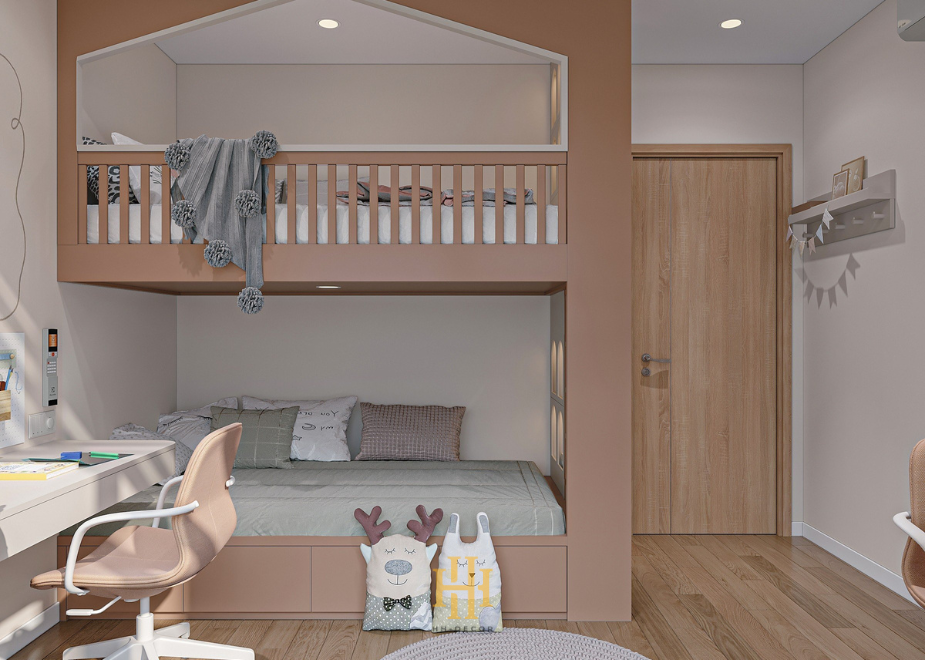 Hai phòng ngủ được bố trí hợp lý, đảm bảo sự riêng tư cho từng thành viên. Phòng ngủ chính được trang trí theo tông màu xám nhẹ nhàng, với giường ngủ lớn, tủ quần áo âm tường và bàn trang điểm nhỏ xinh. Phòng ngủ của cô con gái là một thế giới màu hồng ngọt ngào. Giường tầng với cầu thang hình độc đáo không chỉ tiết kiệm diện tích mà còn là nơi vui chơi lý tưởng cho bé.