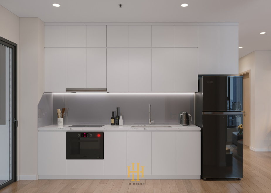 Phòng khách liền bếp được thiết kế theo phong cách hiện đại tối giản, với bộ sofa màu xám thanh lịch, bàn trà hình tròn bằng kính và kệ tivi treo tường. Tủ bếp màu trắng sáng bóng kết hợp với mặt đá sang trọng, vừa đủ để đáp ứng nhu cầu nấu nướng của gia đình ba người.