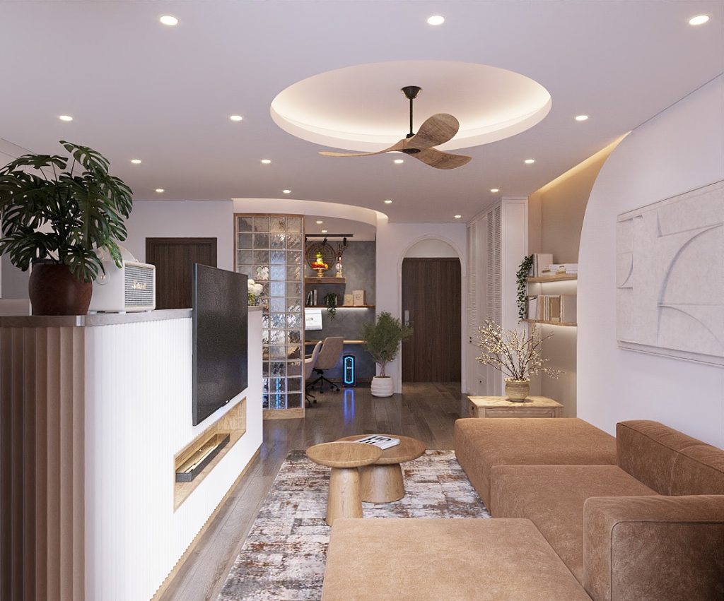 - Phòng Khách được thiết kế với những gam màu trung tính nhẹ nhàng, kết hợp với các đồ nội thất gỗ tự nhiên tạo cảm giác gần gũi, ấm cúng. Những chiếc ghế sofa mềm mại và bàn trà đơn giản tạo nên một không gian lý tưởng cho những buổi sum họp gia đình hay tiếp khách.