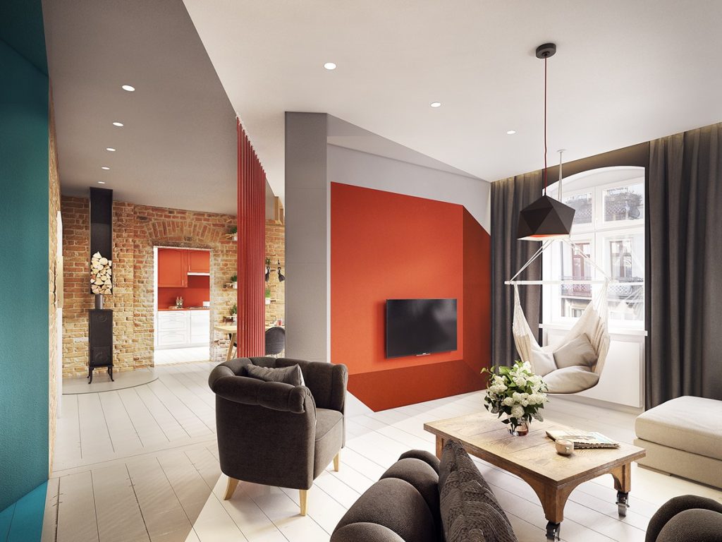 Một ví dụ điển hình là việc sử dụng ghế sofa màu đỏ rực rỡ trong phòng khách hiện đại. Sự tương phản giữa màu đỏ và tông màu trung tính của các món đồ nội thất khác sẽ giúp tăng thêm sự thu hút, mà vẫn đảm bảo được sự cân bằng, hài hòa cho không gian.