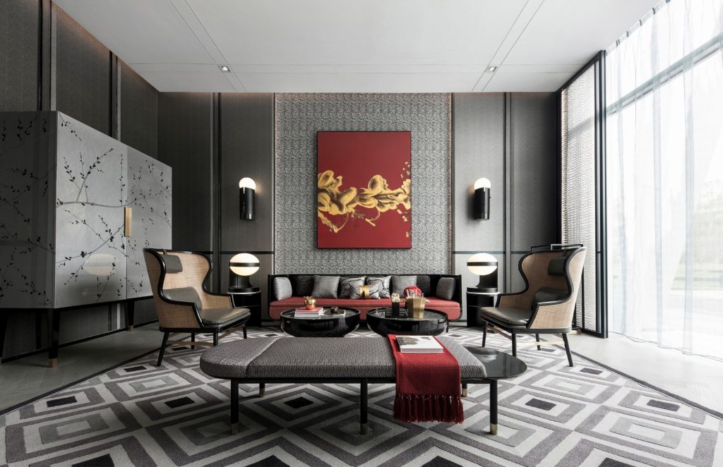 - Màu sắc chủ đạo trong căn hộ chung cư này là gam màu đỏ, đen, vàng kết hợp cùng các chi tiết trang trí đặc trưng của phương Đông.